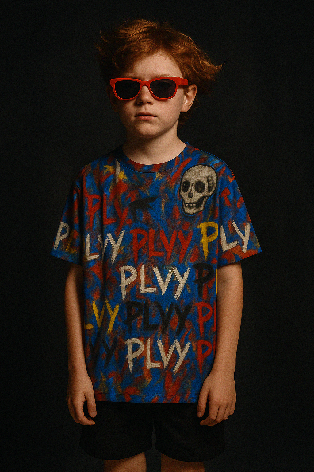 The Lil Graff God Tee is for the kid who colors outside the lines — and makes the rules while doing it. Inspired by Basquiat’s rebellious strokes and raw creativity, this limited-edition tee layers multicolor PLVY tags over a blue flame backdrop with a sketched skull icon stamped on the chest. Every brushstroke screams movement, mood, and mischief. Oversized for comfort, but bold enough to be framed.