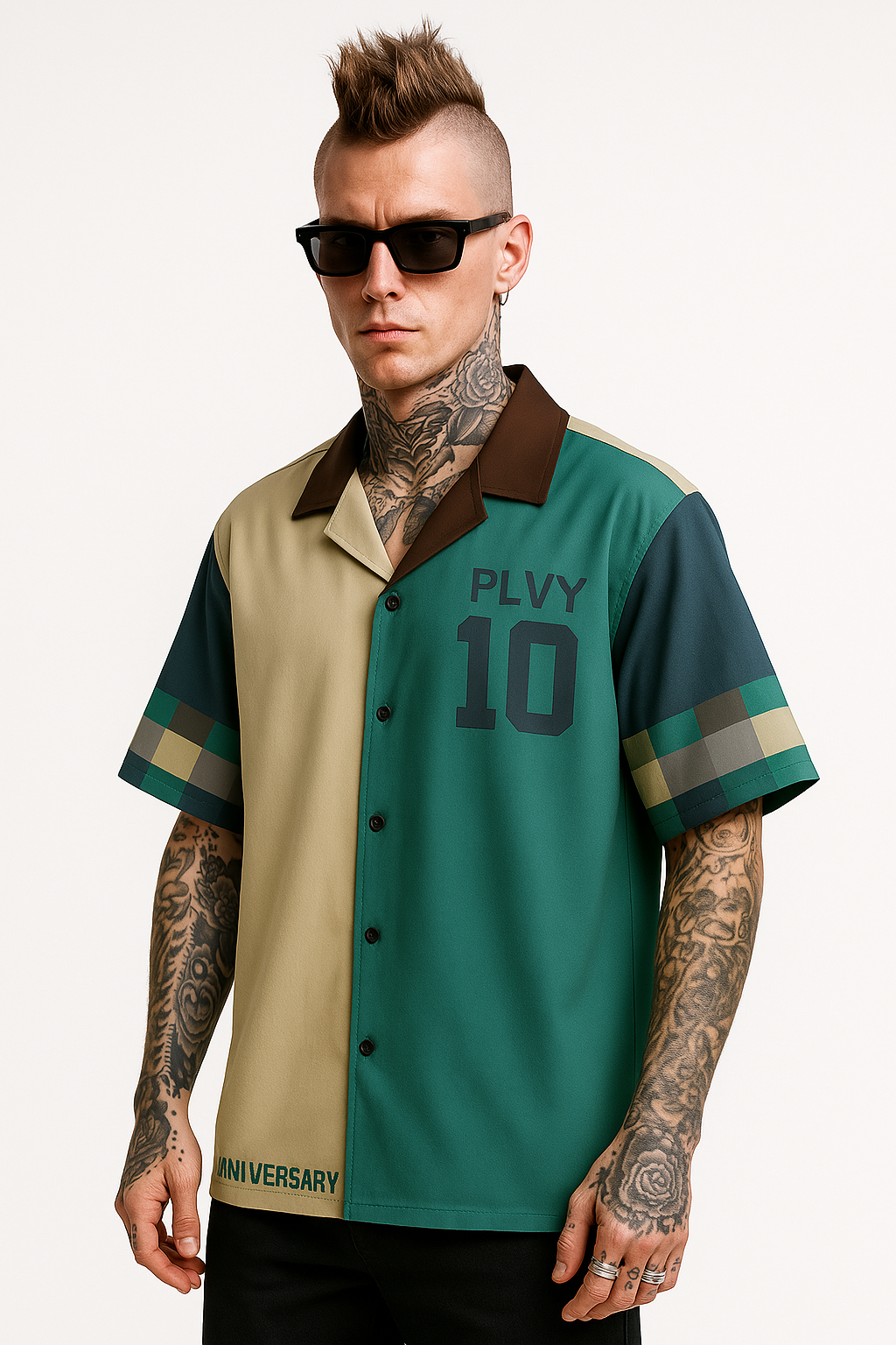 The Decade Deep Button-Up celebrates ten years of rebellion stitched in every seam. Designed in colorblock symmetry with earthy tan and forest green panels, pixel arm striping, and a sharp contrast collar, this shirt nods to PLVY’s first blueprints while flexing where we’re headed next.