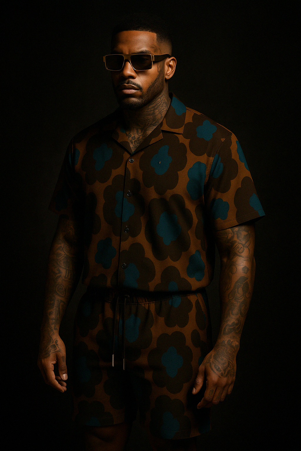 This isn’t your average floral. The Power Petal Set flips the script on masculinity with a heavy-hitting brown-and-teal oversized petal print—cut into a relaxed camp-collar shirt and matching drawstring shorts. Crafted from a breathable woven fabric that moves like luxury and wears like rebellion, this set is meant for men who show up loud and leave louder. Button it up or leave it open over a tank and chains. Whether you’re flexing at brunch, poolside, or at the next PLVY drop, this set makes sure they know: you didn’t come to play. You came to press PLVY.