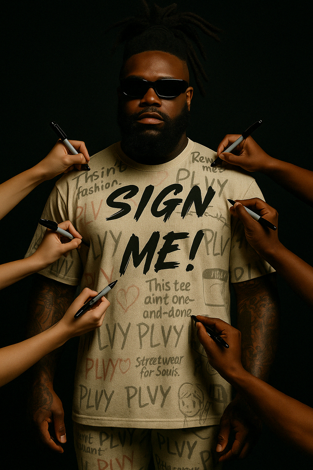 The “Sign Me!” Tee is the ultimate interactive piece. Inspired by cast culture, concert tees, and the nostalgia of yearbook scribbles, this shirt is made to be covered in memories. It comes pre-printed with PLVY graffiti, rebellious quotes, and raw sketches — but leaves space for signatures, doodles, and inside jokes. Wear it out, let friends write on it, and turn it into a personal archive of moments.