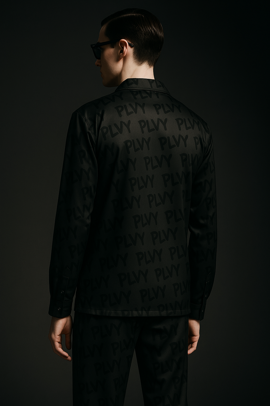The Shadow Script Button-Up and Black Label Bottoms are dipped in jet black, then flooded with tonal PLVY tags — repeating like a whispered anthem only real ones can read. Crafted in luxe satin with a subtle gloss, the set glides like smoke and fits like reputation. The contrast buttons pop just enough. Everything else? Lowkey lethal.