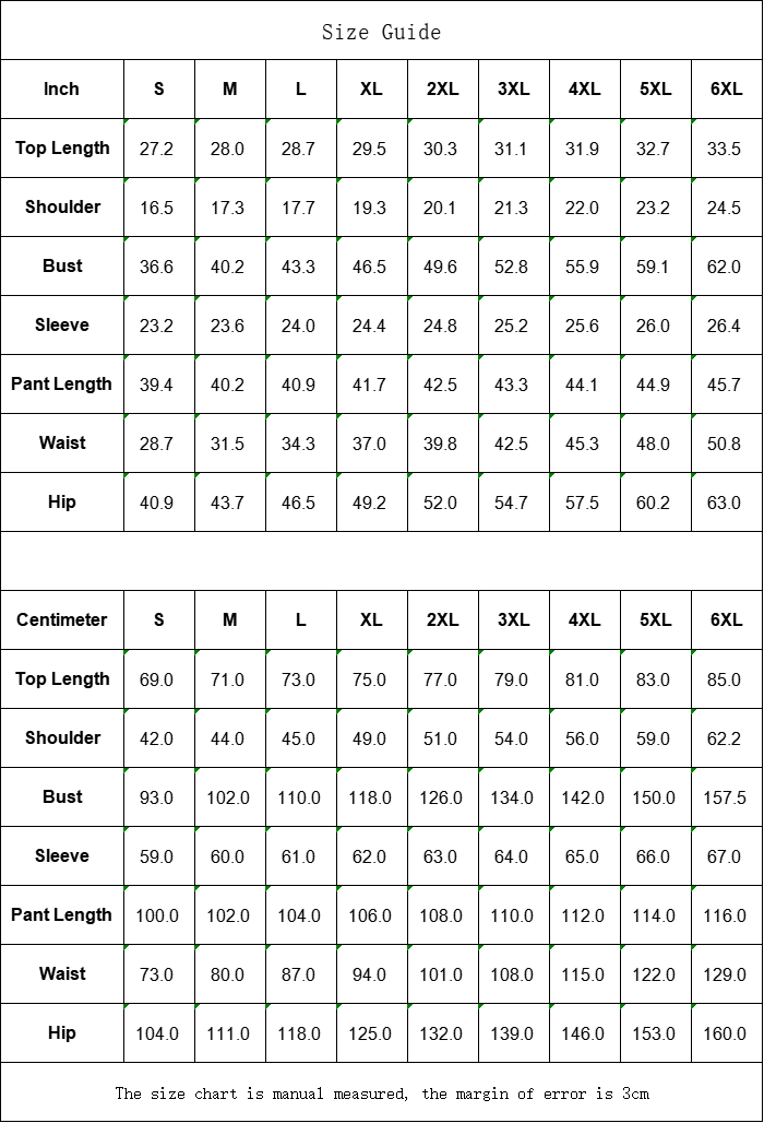 Centimeter | S | M | L | XL | 2XL | 3XL | 4XL | 5XL | 6XL |