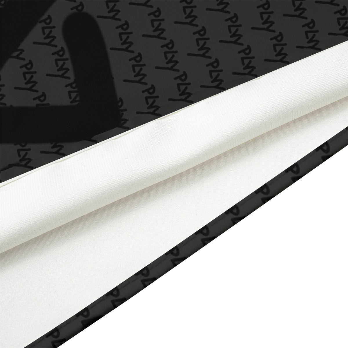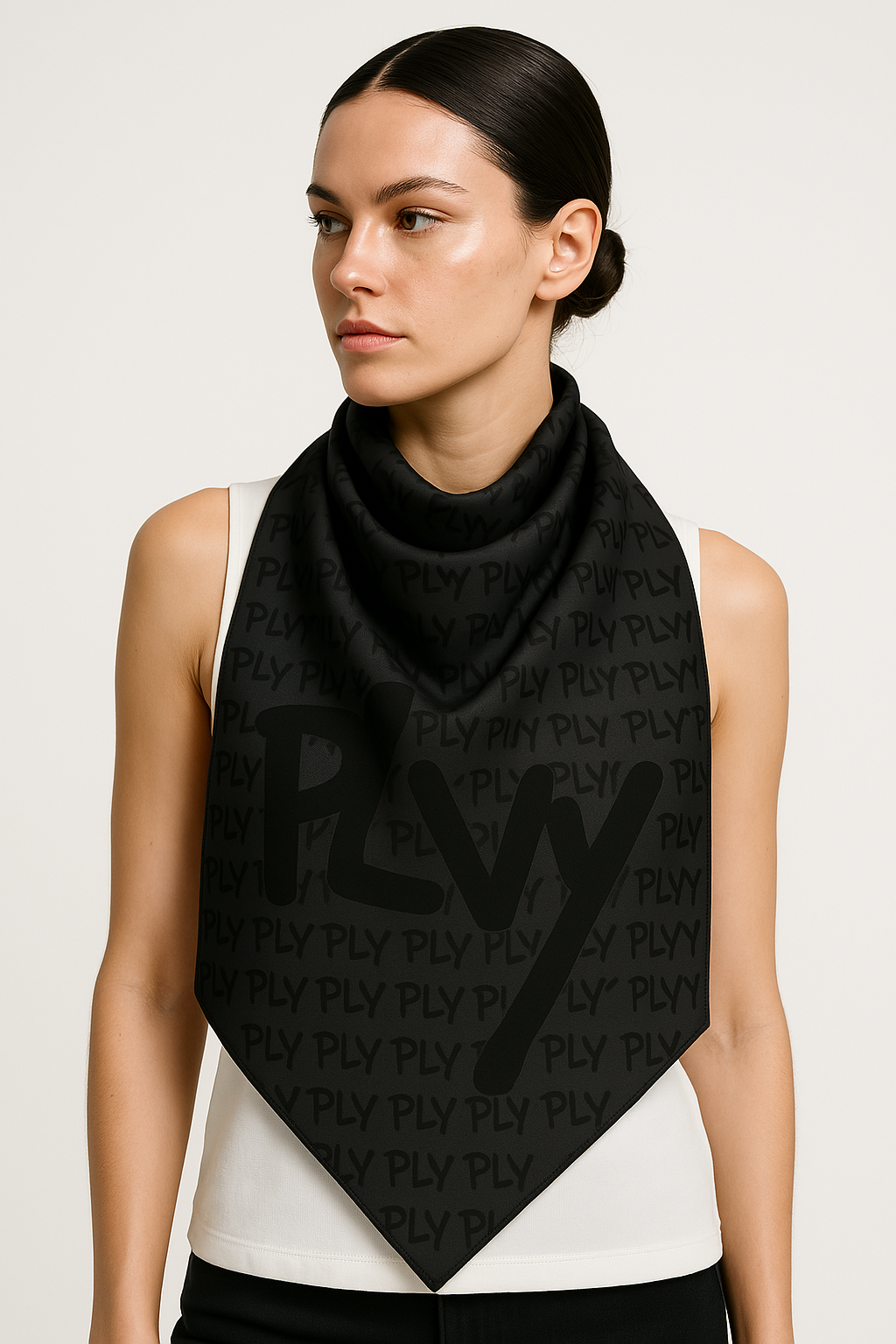 Fully wrapped in a repeating black PLVY monogram print and punctuated with a bold oversized graffiti logo, it’s equal parts streetwear code and luxury staple. The triangular cut drapes clean across the chest, making it just as perfect for layering under a trench as it is for topping a minimalist fit.