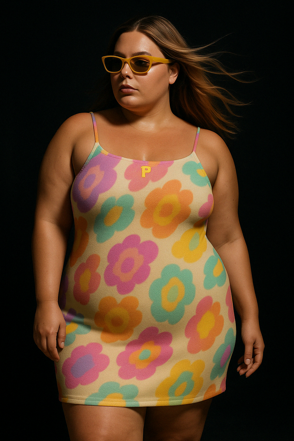 The Bloom Threat Slip Dress is sweet until you step back and realize — it’s a weapon. This candy-coated curve-hugging dress explodes with oversized pastel florals against a cream base, wrapping your body in soft rebellion. Made from a buttery-stretch fabric that molds without suffocating, this plus-size statement piece features dainty straps, bold confidence, and a signature yellow ‘P’ stitched at the chest like a warning sign: you’re messing with PLVY royalty. Wear it loud. Wear it soft. Either way, you just made the world your garden.
