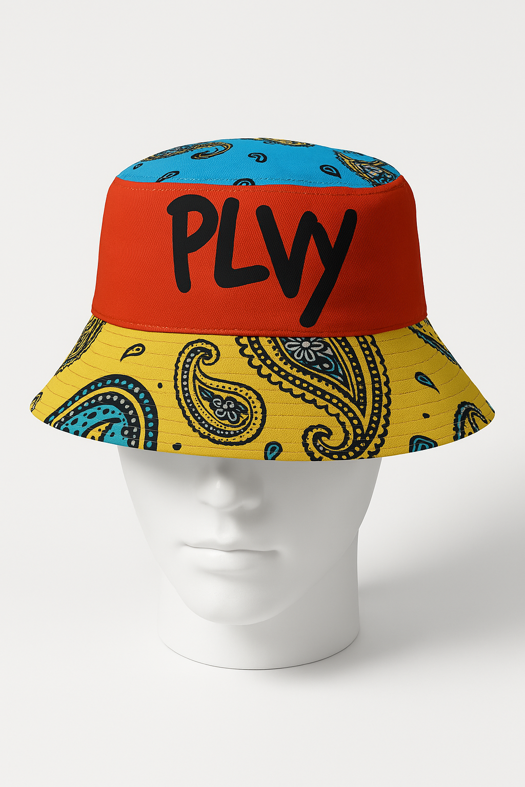With a blazing red front panel stamped in graffiti-style PLVY, framed by sun-charged yellow paisley and topped in sky blue, this bucket hat turns your head into a billboard. It’s not just pattern-on-pattern — it’s a clash with a cause.