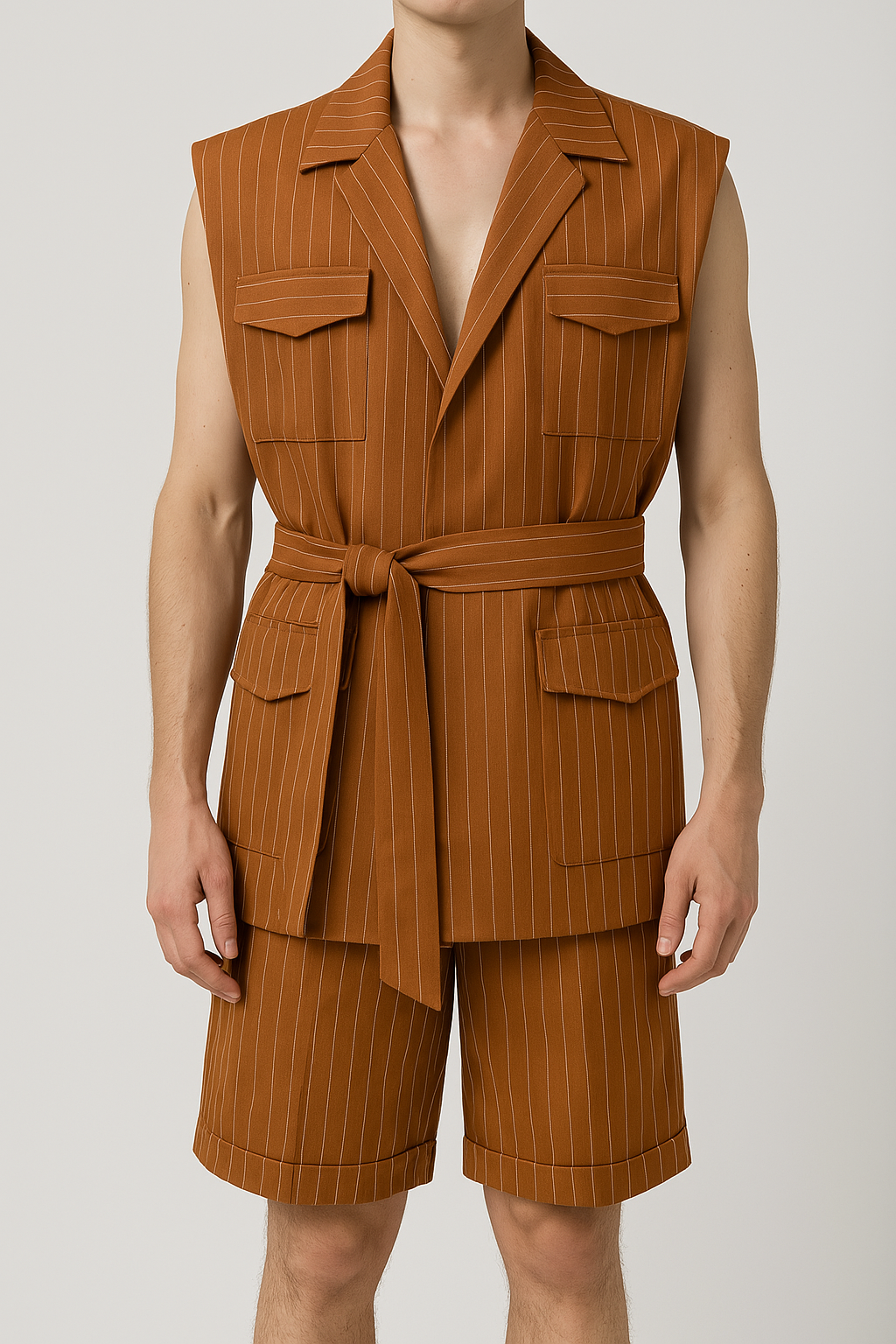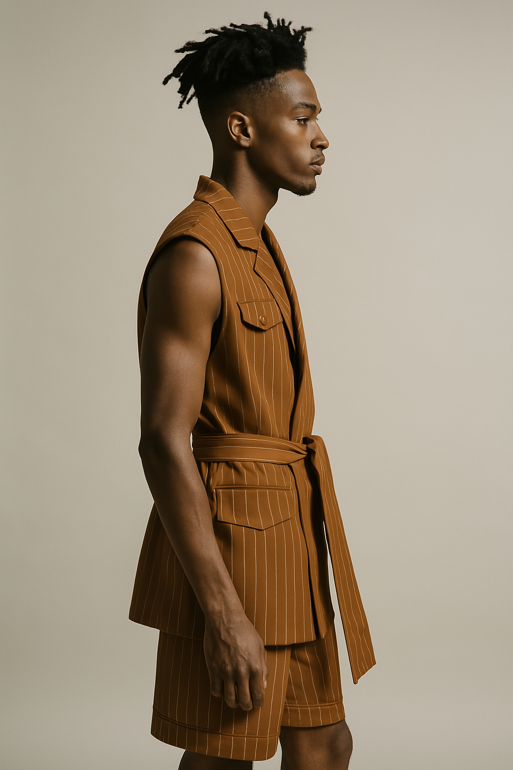 This set doesn’t whisper. It commands. A belted poncho cut in burnt orange pinstripes, draped like a royal decree. Cinched at the waist, it blurs the line between militant elegance and runway sermon. Paired with structured matching shorts that move like they’ve got somewhere to be. This is for the ones who walk in like they’ve already been quoted. Sunstroke Sermon is a statement you wear before they ask your name.